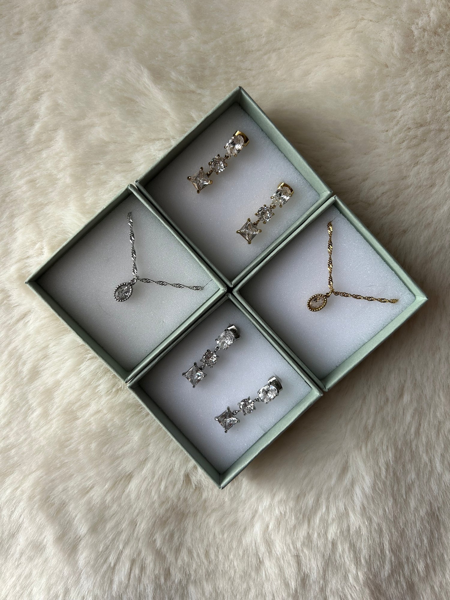 Découvrez également la collection spéciale Saint-Valentin : un collier et une paire de boucles d'oreilles, disponibles en doré et en argenté. Choisissez les séparément ou en ensemble avec le lot Cristallin, selon vos envies et vos accords de couleurs. Des pièces élégantes et parfaites pour célébrer l'amour et la beauté de vos instants précieux.